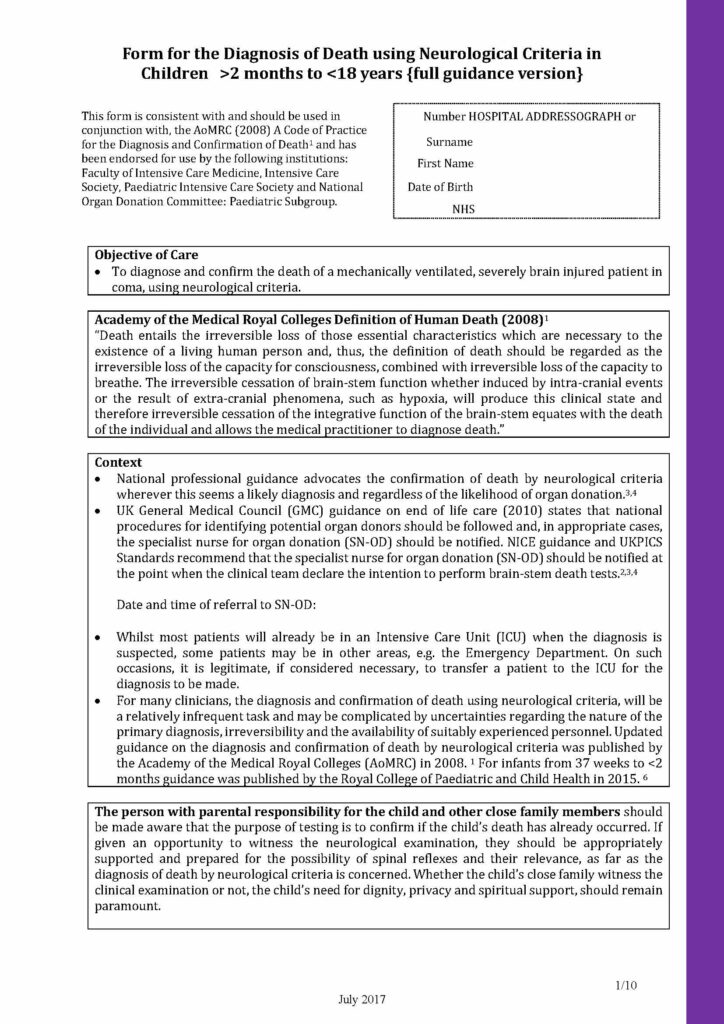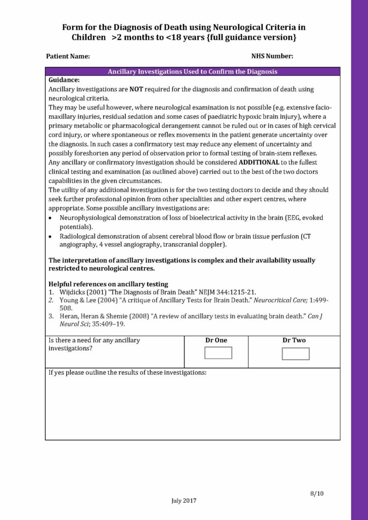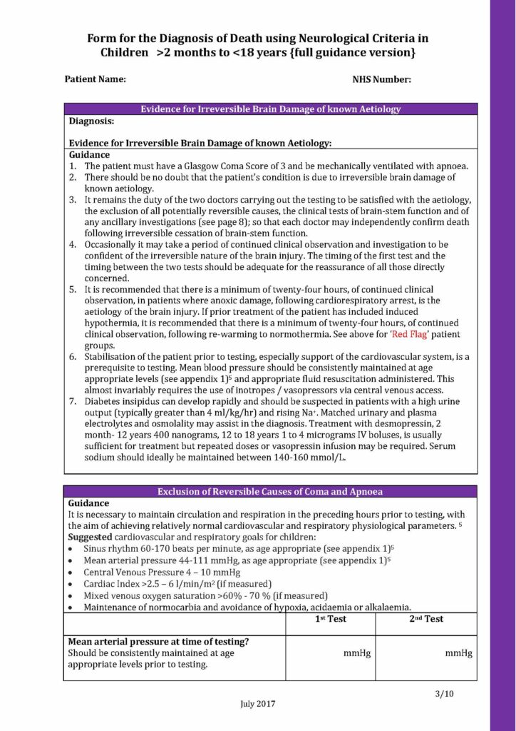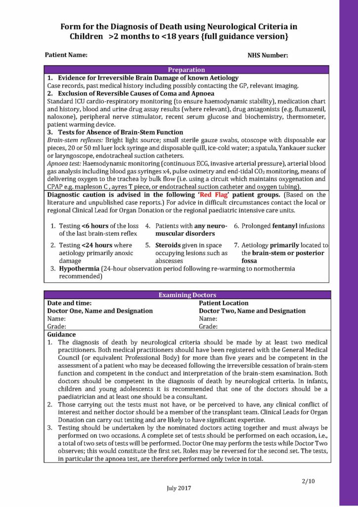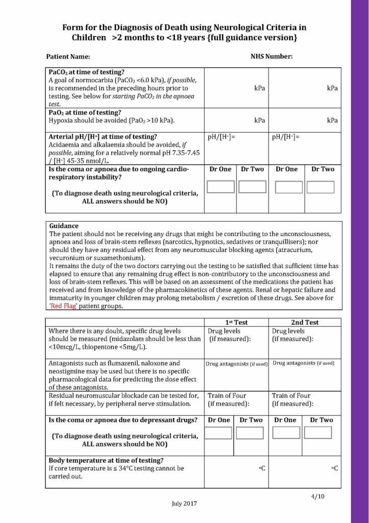 Below you will see a sample of the Form for the diagnosis of death using neurological criteria 2 months to 18 years editable PDF.