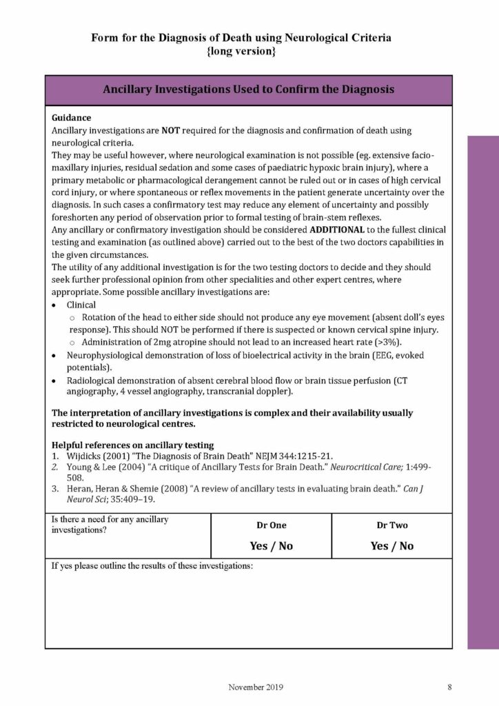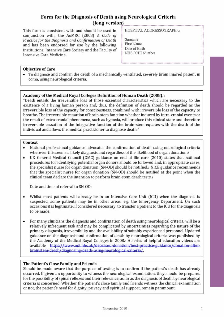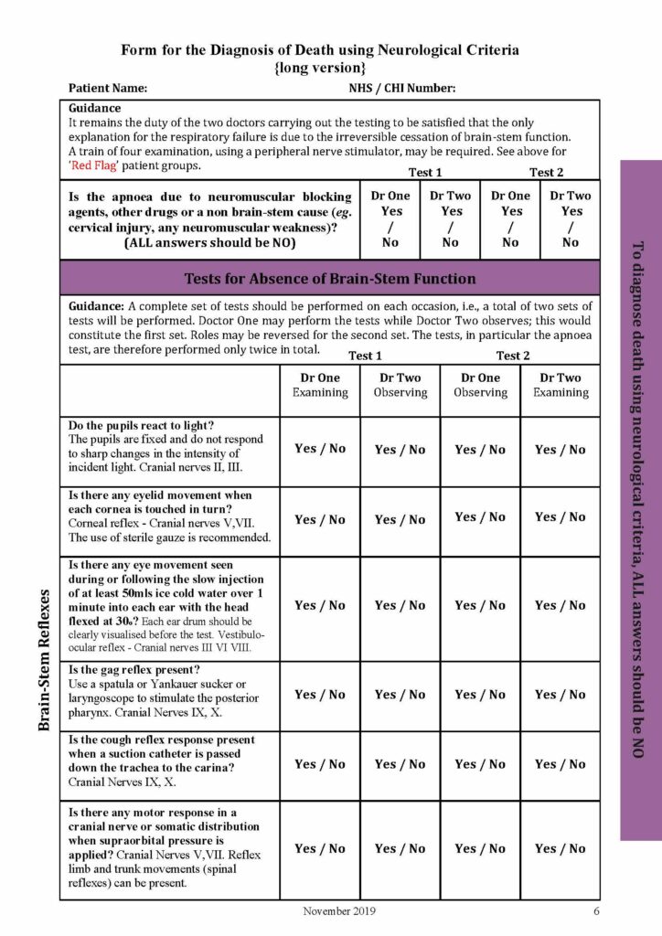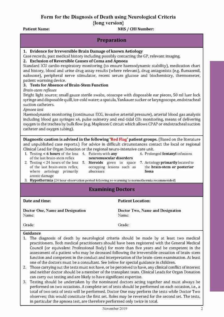 Below you will see a sample of the Form for the Diagnosis of Death using Neurological Criteria PDF Nov 2019.